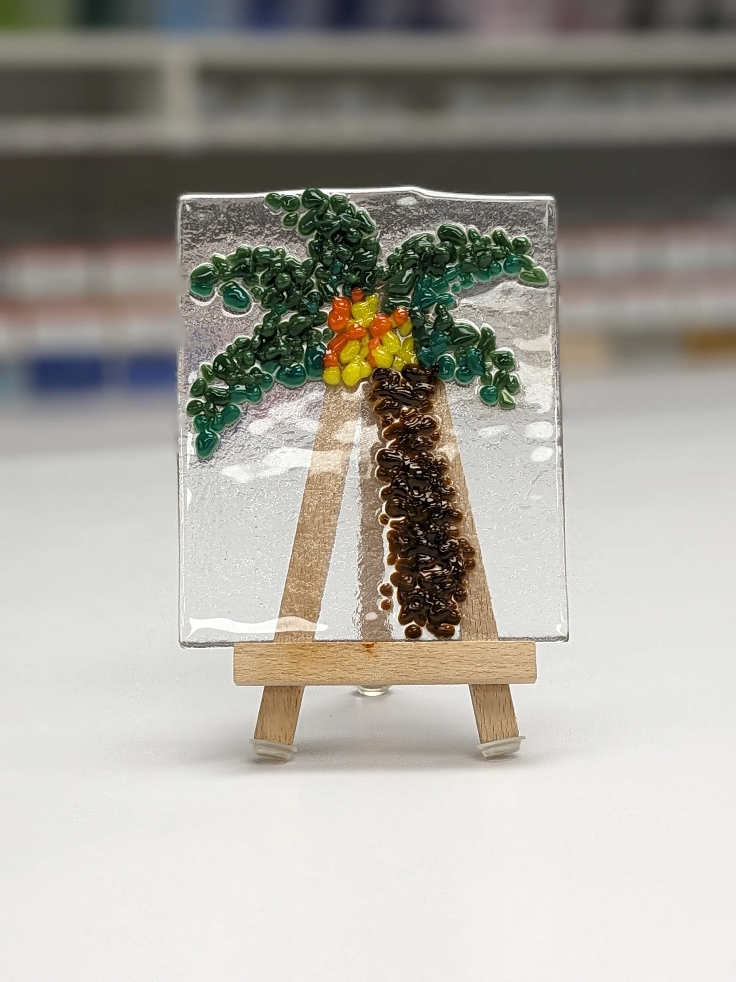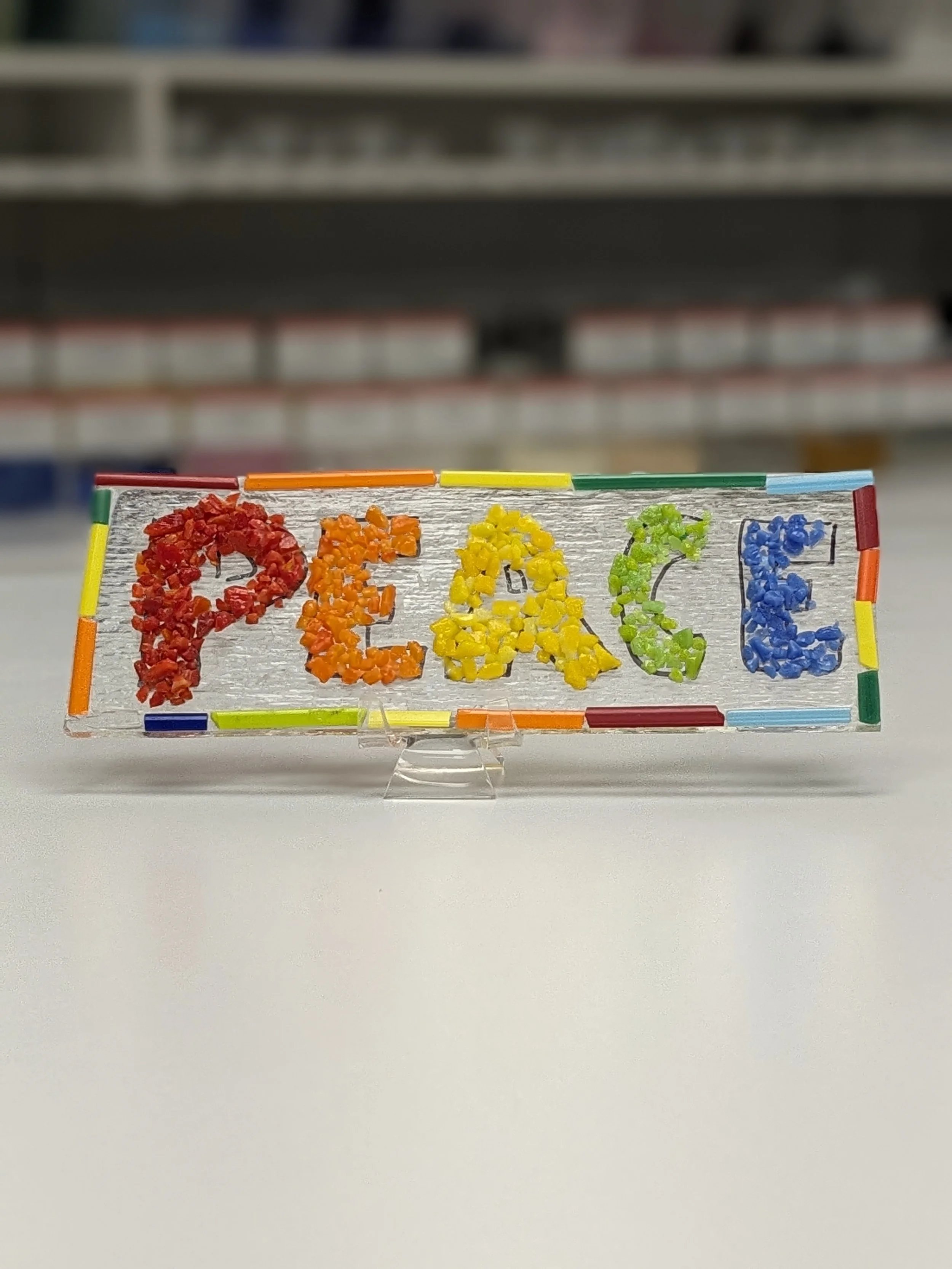 Start with a 4x6” base and choose a letter. Then simply outline the letter using colored pieces of glass.