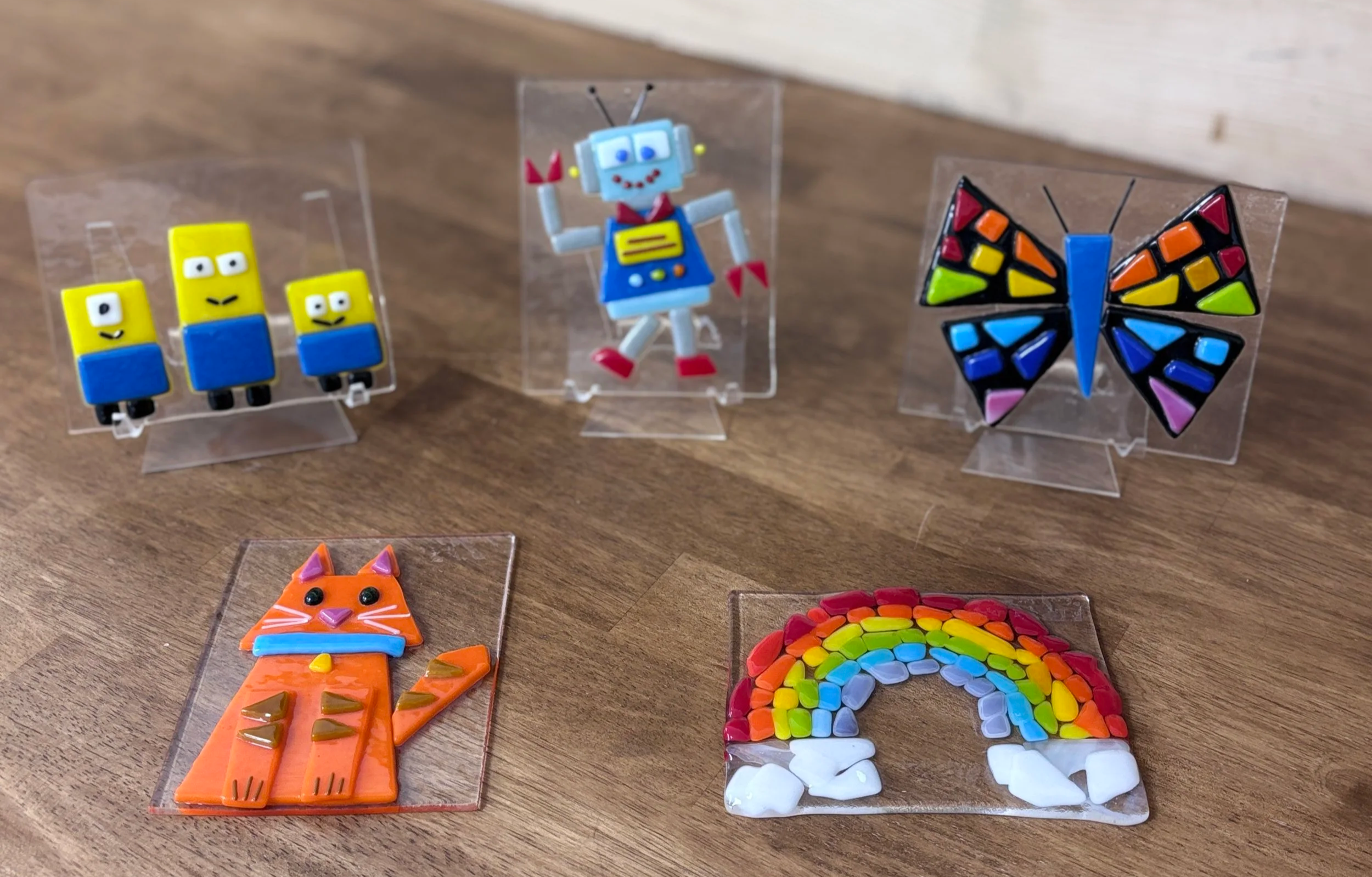 Our youngest visitors usually work on it with an adult — gluing each piece of glass down to a clear base. Like everything in the studio, the project is left with us for firing, and ready for you to pick up within one to two weeks.